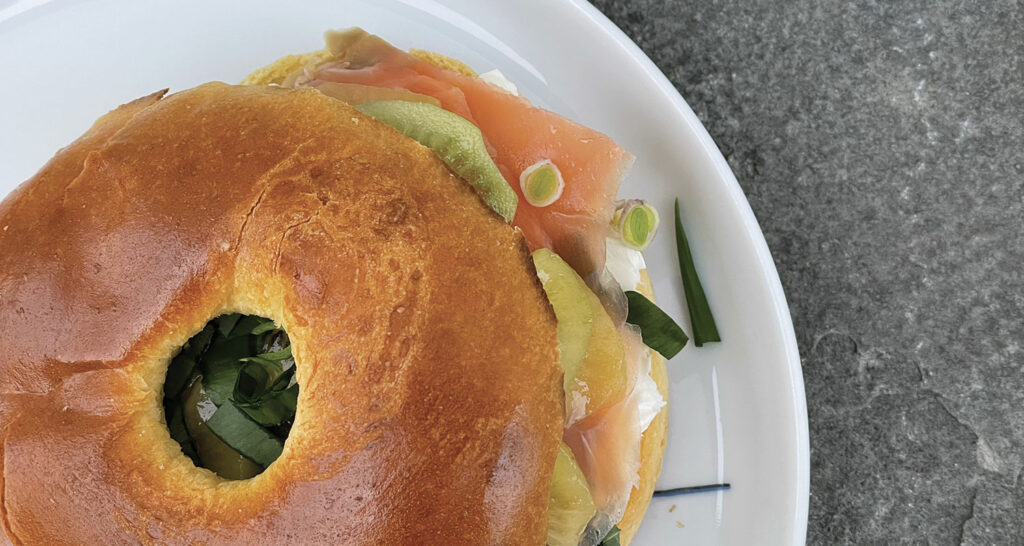 Bagel truite fumée, kiwis et ail des ours