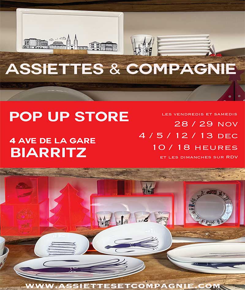 Comme chaque année, l’atelier d’Assiettes & Compagnie organise une vente spéciale pour Noël… La vente aura lieu au siège de la société au 4 avenue de la gare à Biarritz. Le pop up store sera ouvert en continu les vendredis et samedis , et le dimanche sur rendez-vous. Les autres jours, je serai à l’atelier de La Bastide Clairence pour assurer les commandes Internet et les cuissons des pièces.