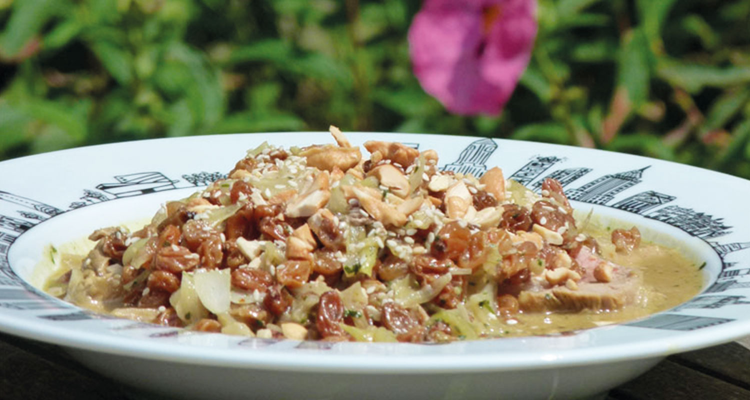 Faites chauffer votre wok avec un peu d’huile d’olive et mettez le poulet à cuire à feu vif en tournant très souvent, mettez dès le départ toutes vos pincées d’épices… puis rajoutez les oignons et aillet, les raisins blond et mettez un filet de sauce soja… tournez encore et baissez un peu le feu…
