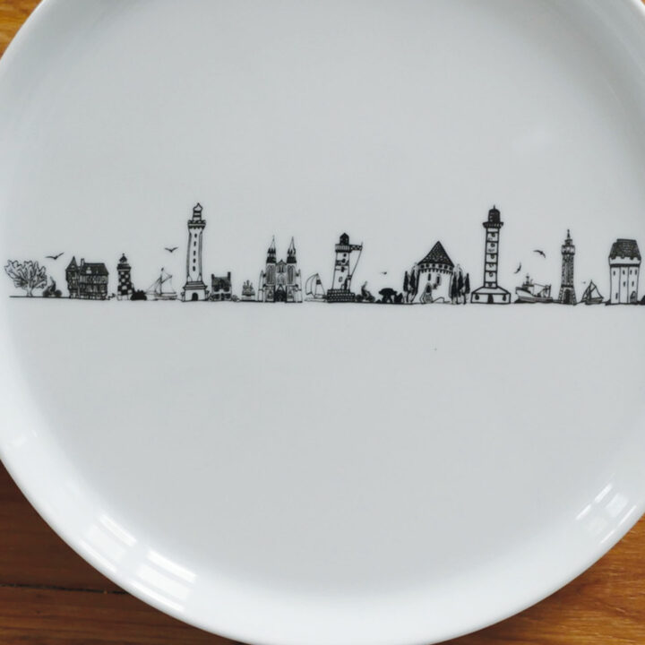 Le dessin rend hommage à la Bretagne, ses monuments et ses emblèmes : du nord au sud de la Bretagne découvrez les phares, les ports, les forts, les maisons traditionnelles et les lieux mythiques…