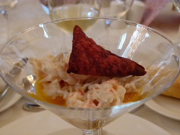Je vous présente aussi une très bonne entrée de notre repas de gala (Julienne de crabe Chatka et purée de potiron, sauce aux airelles » une alliance originale pour un résultat bluffant
